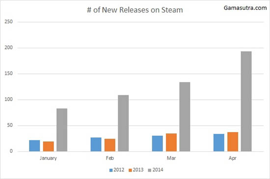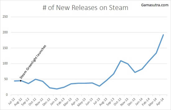 Как показывает график, с каждым месяцем 2014 года количество выходящих на платформе Steam игр экспоненциально растёт. Если в 2013 году сообщение о выходе новой игры на главной странице Steam могло продержаться несколько дней, то сегодня оно наверняка будет заменено другим в течение суток. Неудивительно, что теперь на домашней странице по умолчанию отображаются самые популярные игры вместо наиболее новых.