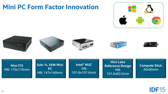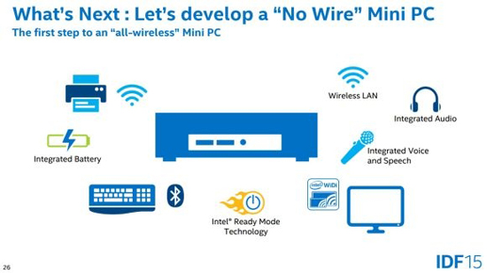 Устройства NUC, сообщают тайваньские источники, были встречены с интересом как публикой, так и производителями. В текущем году компания Intel планирует расширить своё присутствие в нише «малолитражных» ПК. Помимо NUC будут выпускаться произвольные минисистемы с объёмом корпуса менее одного литра, и пара новых формфакторов. Один из них уже можно найти в продаже — это USB-донгл Compute Stick. Второй — это представленный на прошлой неделе на IDF 2015 мини ПК Mini Lake PC. Система Mini Lake PC представляет собой корпус со сторонами 101,6 на 63,5 мм и, что более интересно, предполагает работу без каких либо проводных подключений. По сути дела, Mini Lake PC работает на батарейках (на аккумуляторе).