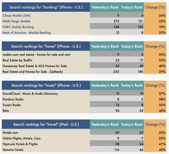 В среднем, уровень ранжирования изменился на 40% для большинства приложений если говорить только про раздел App Store для США. Это означает, что многие из приложений изменили свое расположение в ленте при поиске в App Store на 5 пунктов и больше.