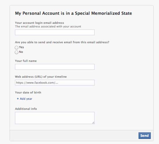 Существует и специальная процедура такого перевода. Родственники, друзья или знакомые (по сути — кто угодно) умершего пользователя социальной сети должны зайти на специальную страницу, заполнить форму и прикрепить ссылку на некролог данному человеку в сети.