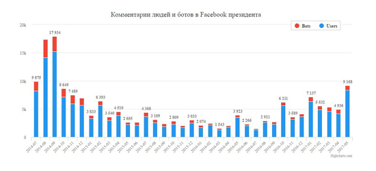 Как подсчитали эксперты, за время президентства Порошенко (с июня 2014 по май 2017 года) более 79 тыс. уникальных Facebook-пользователей написали хотя бы один комментарий на его официальной странице, сделав в совокупности около 176 тыс. сообщений. Исследования показали, что 98% комментаторов (или 77,5 тыс.) - это реальные люди.