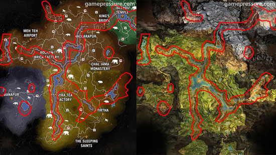 В картах игрового мира обоих игр существуют определенные сходства. Среди них числятся характерные топографические структуры и разделение на регионы, которые встречались в прошлой части серии. После сравнения обоих карт бок о бок можно невооруженным глазом заметить, что структура реки, и других акваторий практически идентична. Но есть и некоторые различия, к примеру, отсутствие дорог и различных отметок на карте доисторического шутера.