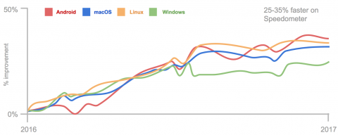Для измерения реальной производительности JavaScript-движка разработчики создали новый бенчмарк Speedometer, проверяющий широко используемые библиотеки JavaScript. Его результаты показали, что типичные веб-страницы в большей мере полагаются на то, сколько времени требуется для запуска скриптов. Поэтому за последний год было проведена работа по оптимизации, что привело к увеличению времени загрузки сайтов на 10-20% в зависимости от архитектуры процессора.