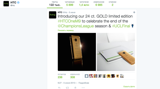 Конечно же, одного создания и презентации золотой новинки было бы явно недостаточно. По этой причине представители компании решили сфотографировать аппарат и опубликовать снимок в официальном твиттере. Всё было бы просто замечательно, если бы не одно «но». Процесс съемки осуществлялся при помощи чуть ли не главного представителя лагеря конкурентов — iPhone 6. Увидеть его можно в правом нижнем углу корпуса смартфона HTC.