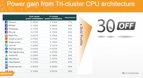 Компания MediaTek официально представила новый трёхкластерный десятиядерный процессор Helio X20, который включает группу из двух ядер ARM Cortex-A72 с частотой 2,5 ГГц и ещё две группы по четыре ядра ARM Cortex-A53, способные менять частоту работы от 1,4 до 2 ГГц. Многие спорят о целесообразности использования подобных решений в мобильных устройствах, однако MediaTek утверждает, что новый процессор расходует заряд аккумулятора на 30% эффективнее, чем существующие двухкластерные системы на кристалле. В качестве доказательства приводятся результаты собственного исследования, в котором представлены сравнительные данные потребления энергии у различных приложений на референтных устройствах с двумя и тремя кластерами ядер.