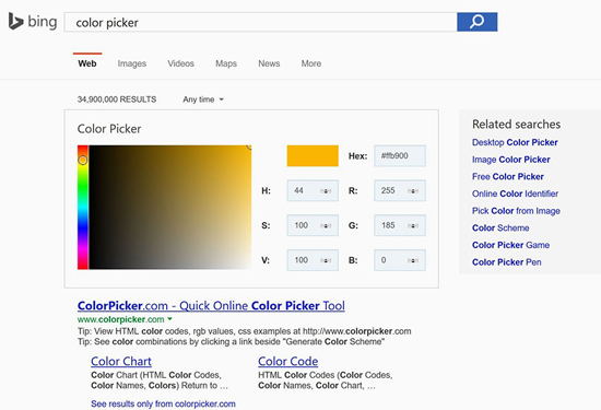 Кстати, не так давно Microsoft добавила инструмент выбора цветов с представлением в различных форматах (HSV, Hex, RGB) на странице результатов поиска Bing.