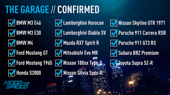 Компания Electronic Arts анонсировала список автомобилей, которые появятся в перезагрузке серии Need for Speed. В игре появятся все ключевые автомобили, которые красовались на обложках прошлых игр серии.