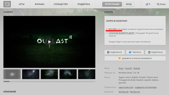Компания Red Barrels не собирается устанавливать защиту Denuvo в своем новом ужастике Outlast 2. К такому выводу пришли геймеры глядя на появление игры на площадке GOG.