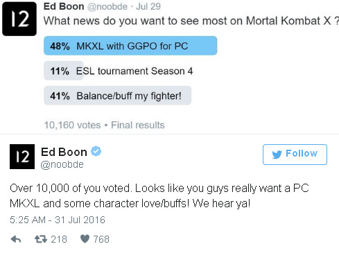 На своем канале в твиттере в конце июля Эд Бун (Ed Boon) опубликовал статистику последнего опроса, в котором игроков спрашивали о том, какую бы новость об игре они хотели видеть больше всего. И почти половина опрошенных геймеров выступила за релиз полного издания Mortal Kombat XL на PC с технологией GGPO, которая позволила бы играть без лагов.