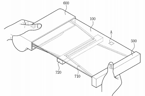 Конструкция предложенного устройства включает основной модуль в виде цилиндра, в который прячется скручивающийся экран. Для вытягивания гибкой панели служит специальный захват. При этом в развёрнутом виде дисплей остаётся плоским благодаря особой системе складных направляющих (см. иллюстрации).