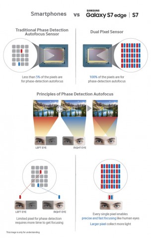 В новых флагманах Samsung используется сенсор Sony IMX260 и технология Dual Pixel, ранее применяемая только в профессиональных зеркальных камерах. Эта технология пришла на смену фазовому автофокусу. В смартфонах, где используется фазовый автофокус, в том числе и в Galaxy S6 или iPhone 6S, в процессе фокусировки работает менее 5% пикселей. В случае с Dual Pixel, при фокусировке используется каждый пиксель, что увеличило точность и скорость этого процесса. Samsung уверяет, что камера Galaxy S7 видит изображение, подобно человеку.