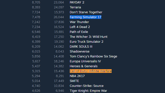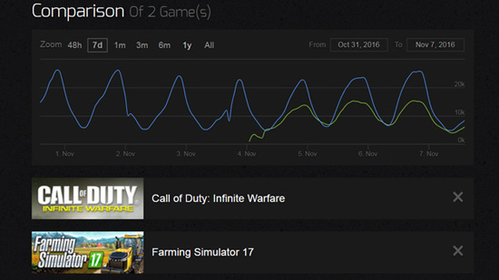 Стоит отметить, что пик по количеству игроков, как правило, приходится на момент выхода игры. Затем, в подавляющем большинстве случаев количество игроков постепенно снижается. Учитывая, что релиз симулятора тракторов и агротехники состоялся еще 24 октября, можно предположить, что Farming Simulator 17, по меньшей мере вдвое популярнее Call of Duty: Infinite Warfare среди пользователей Steam.