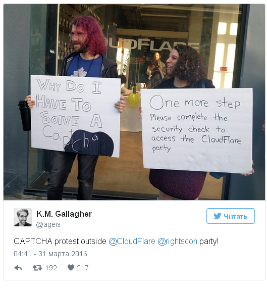 31 марта активисты, поддерживающие TOR Project, устроили пикет перед входом на вечеринку CloudFlare. «Почему я должен решать каптчи?» — написано на плакате, который держит один из его участников. Вредоносные боты — не его забота.