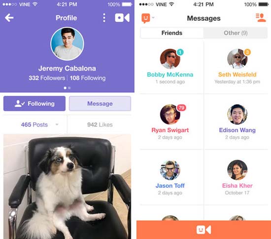Сообщения Vine не ограничиваются только контактами в Vine, приложение позволяет отправить VM кому угодно с помощью SMS или по электронной почте, даже если пользователь не зарегистрирован на сервисе. Чтобы отправить ролик Vine, откройте вкладку «Сообщения» и нажмите кнопку «Сообщения» в профиле своих друзей.