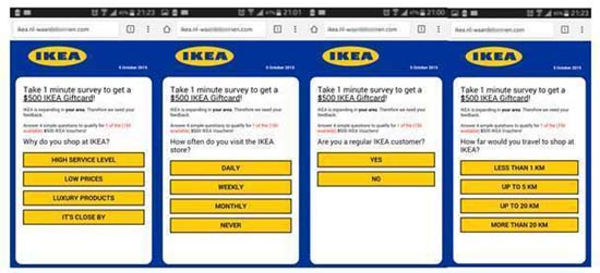 Чтобы принять участие в розыгрыше, пользователю предлагают заполнить специальную анкету на стороннем сайте. Она обычно оформлена как фирменная страница известной компании, например McDonald’s или IKEA. От пользователя требуется ввести свое имя, адрес электронной почты, номер мобильного телефона. Но быстрых денег ждать не стоит. Вместо этого доверчивого пользователя подписывают на платные SMS-сервисы или устанавливают ему нежелательные приложения, а его персональные данные перепродают.
