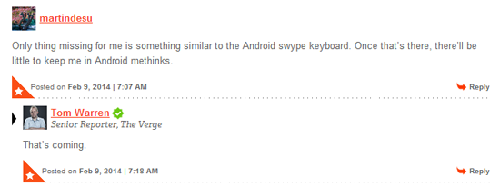 Старший редактор The Verge Том Уоррен подтвердил, что на Windows Phone 8.1 появится клавиатура, которая позволит печатать предложения, не отрывая палец от экрана. Не доверять словам Уоррена нет причин, он видел обновление 8.1 своими глазами.
