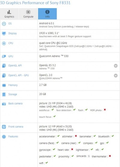 В бенчмарке GFXBench замечен новый флагман компании Sony, оснащенный мощным четырехъядерным процессором Qualcomm Snapdragon 820 и 3 ГБ ОЗУ. Объем встроенной памяти составил 32 ГБ. Работает устройство на базе Android 6.0 Marshmallow.