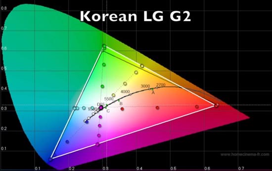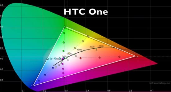 Треугольник с черными ребрами — гамма цветности sRGB, с белыми — охват AMOLED-экрана Samsung Galaxy S4. Можно заметить, что в гамме Galaxy S4 неестественно много синего и зеленого. Точками показано, насколько равномерно происходит изменение оттенков цвета. В идеале расстояние между точками должно быть одинаковым.
