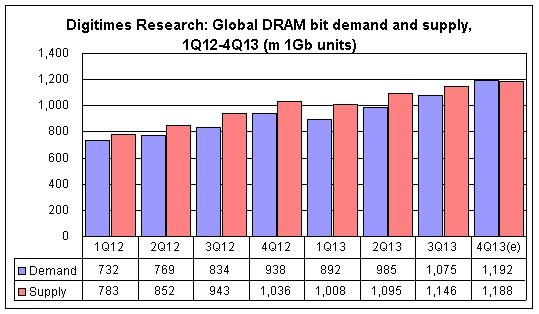 Также в аналитическом отчёте Digitimes Research сообщается, что глобальные поставки чипов памяти за 2013 год достигнут 4,44 млрд. чипов в 1-Гбит эквиваленте, что означает 22,8-процентное увеличение этого рынка по сравнению с 2012 годом. Это значит, что в целом рост потребления памяти серьёзно замедляется. Напомним, производство памяти в 2012 году возросло на 31,4 процента, в 2011 – на 38,7 процента, а в 2010 – на 56,5 процента.