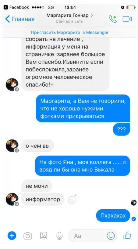 Недавно в Днепре появились очередные любители чужих денег. Они рассылали в сети Facebook сообщения такого содержания: «Здравствуйте, извините, что обращаюсь к вам за помощью…», а далее вас очень вежливо просят помочь собрать средства на лечение мальчика, перейти на страницу, где указана карта одного из банков, на которую и нужно перечислить деньги. Интересно, что для аферы были почему-то выбраны фото журналистки из Днепра Яны Коваль, только назвали мошенники выдуманную страницу именем Маргариты Гончар.