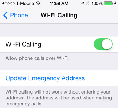 В настройках iPhone, работающих в сетях американского оператора T-Mobile, есть выключатель Wi-Fi Calling. Технология работает только после того, как пользователь укажет свой домашний адрес (для экстренных случаев). В США два мобильных провайдера предлагают услугу Wi-Fi Calling – T-Mobile и Sprint. T-Mobile официально заявила о поддержке Wi-Fi-звонков для iPhone.