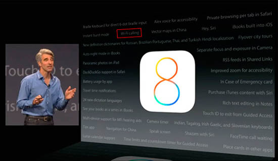 2 июня на конференции для разработчиков WWDC 2014 компания Apple представила операционные системы iOS 8 и OS X 10.10 Yosemite, а также фитнес-платформу Healthkit, «умный» дом HomeKit и новый язык программирования Swift. Среди наиболее интересных нововведений мобильной платформы iOS 8 стала поддержка технологии Wi-Fi Calling, она позволяет совершать и принимать голосовые звонки и SMS при наличии активного Wi-Fi-подключения.
