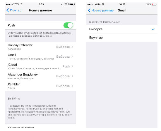 Как оказалось, проблема в том, что теперь письма не из iCloud доставляются без push-уведомлений. Они не поддерживают данную функцию, поэтому для других ящиков можно выбрать только параметр «Выборка» — подгрузка новых писем каждые 15 минут, 30 минут, ежечасно или вручную.