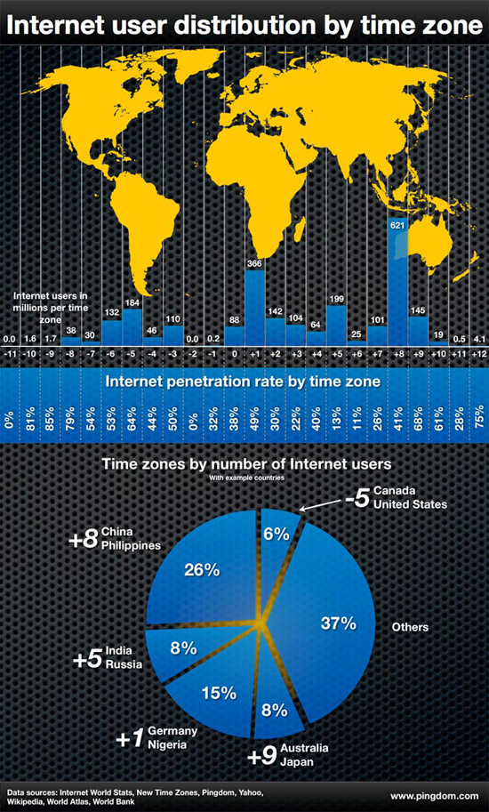 Компания Royal Pingdom повторила исследование, которое делала несколько лет назад, но теперь с новыми данными и более свежей статистикой. Суть осталось прежней: посмотреть, сколько пользователей интернета проживает в каждом из часовых поясов.
