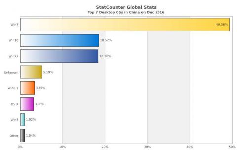 Статистика от компании StatCounter показывает, что на Windows XP в Китае работает едва ли не каждый пятый компьютер, несмотря на рекомендации перейти с неё на более современную версию, вроде Windows 7, 8.1 или 10. Последняя опережает Windows XP менее чем на 0,2%.