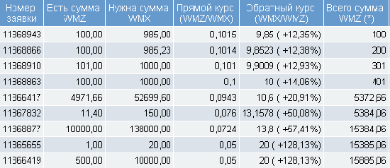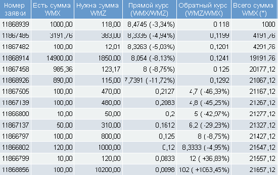На данный момент на продажу выставлено более 21 тысяч WMX, самые выгодные заявки стоят по курсу 8,4745 WMX за доллар.