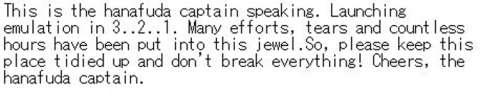 "Говорит капитан ханафуды. Запускаю эмуляцию через 3... 2... 1. Много усилий, слёз и бесчисленное количество часов были потрачены на создание этого сокровища. Так что, пожалуйста, держите это место в чистоте и не сломайте тут всё!", - гласит скрытое послание.