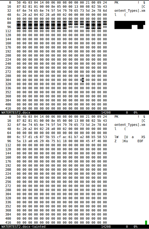 Специалисты сравнили файлы, открыв их в текстовом редакторе, поддерживающим шестнадцатеричный режим отображения. Если в исходном файле в его начали содержались нули, то в измененном файле в этих нулях появился «мусор» — набор, на первый взгляд, произвольных символов, оканчивающихся сочетанием «EOF».