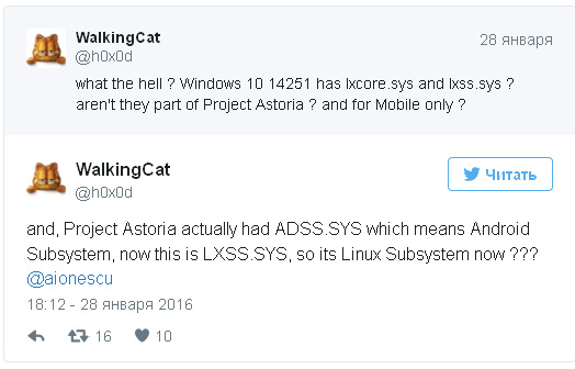 Независимый эксперт, известный в сети под псевдонимом WalkingCat, заметил странные файлы в новом Windows 10 Redstone Build 14251. То ли разработчики Microsoft не просто так работают над собственным дистрибутивом Linux, то ли мост Windows-Android, известный как Project Astoria, был отложен не в самый дальний ящик, как предполагали многие.