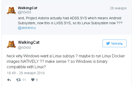 Находка WalkingCat говорит о том, что Project Astoria вовсе не был заброшен и похоронен, как многие предположили после ноябрьского объявления. Файлы Android подсистемы были проименованы похожим образом, к примеру: ADss.sys. С другой стороны приставка «LX» вероятнее всего образована от «Linux», а значит, в Windows 10 теперь, очевидно, присутствует Lunix подсистема.