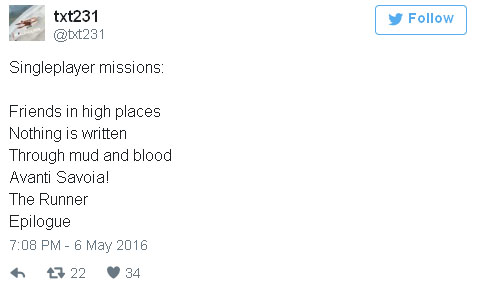 В сети появилась информация о том, что в игре появится всего 6 одиночных миссий. Об этом на своем канале в твиттере сообщил пользователь txt231, огласив названия всех шести миссий. Если верить инсайдеру, «эпизоды» будут называться Friends in High Places, Nothing is Written, Through Mud and Blood, Avanti Savoia, The Runner and Epilogue.