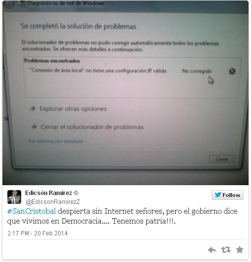 «У нас отключили интернет. Телевидение и радио не передают ничего о происходящем в городе» — написала одна из пользовательниц Twitter. По словам другого пользователя, интернет был отключен по требованию властей страны. «При этом правительство утверждает, что мы живем в демократическом государстве», — подчеркнул молодой человек в том же твите. Другие пользователи сообщают, что некоторые провайдеры (например, Movistar) все еще предоставляют возможность выхода в сеть.