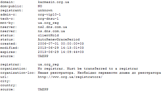 Партия экс-депутата Верховной Рады Юрия Кармазина утратила контроль над доменом karmazin.org.ua в конце июня этого года. У домена закончился срок делегирования, и он был заблокирован. В связи с переходом ORG.UA на платную основу, для восстановления работы домена его нужно актуализировать и перевести на обслуживание к регистратору. Это можно сделать с помощью секретного кода, доступ к которому есть у бывшего администратора сайта. Но, как можно понять из переписки госпожи Лосюк с администрацией ORG.UA, связь с человеком, которому ранее принадлежал домен, была утеряна, а права на сайт переданы в устной форме.