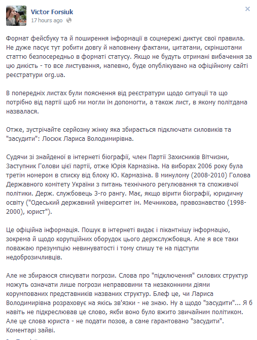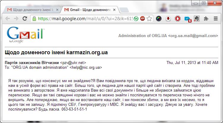 В Сети появилось письмо заместителя главы Партии защитников Отечества Ларисы Лосюк к администратору зоны ORG.UA Виктору Форсюку. В письме политик обещает «найти и засудить» представителей ORG.UA, если ей не будет передан домен karmazin.org.ua, оформленный на бывшего администратора сайта, ныне проживающего за границей. Угрозы подкрепляются обещаниями подключить к решению вопроса СБУ, Генпрокуратуру и МВД.