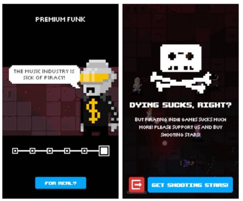 В борьбе с пиратством разработчики игр прибегают не только к стандартным юридическим процедурам. Даже если продукт был взломан и запущен, то всегда остаётся возможность оставить послание нерадивому пользователю или же вовсе устроить ему некомфортный игровой процесс. Так, разработчики из Noodlecake Studios решили "потроллить" потребителей пиратского контента в игре Shooting Stars! Данный проект стоит всего пару долларов, но некоторые пользователи из принципа её не покупают, предпочитая скачивать взломанные бесплатные версии. В пиратской версии Shooting Stars! имеется непобедимый монстр, который, несмотря на все усилия игрока, всегда будет убивать главного героя, не давая ему ни единого шанса выиграть.