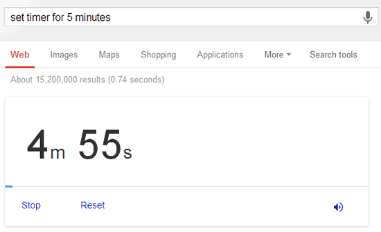 Очень удобную фичу реализовали на сайте Google.com. Если прямо в поисковой строке написать [set timer for 5 minutes], то начнется обратный отсчет с пяти минут, с индикатором прошедшего времени, паузой, перезапуском и звуковым сигналом в конце отсчета.