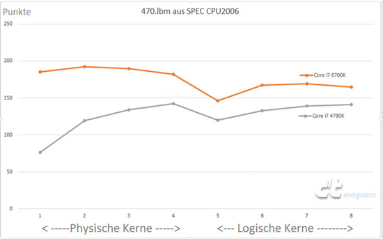 Соответствующее заключение сделал немецкий ресурс, сравнив работу 4-ядерных процессоров Core i7-6700K (Skylake) и Core i7-4790K (Haswell) в тесте SPEC CPU2006. Первые четыре точки графика соответствуют физическим ядрам, а следующие четыре — логическим. Как видно на графике, в случае Haswell производительность растет по мере включения физических ядер, затем снижается при подключении пятого потока и медленно возвращается к максимальному значению по мере дальнейшего увеличения числа потоков.