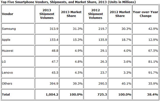 Согласно подсчету аналитиков IDC, в 2013 году было выпущено 1,004 млрд смартфонов, что на 38,4% больше, чем годом ранее. Поставки всех сотовых телефонов выросли на 4,8%, составив 1,82 млрд штук. Таким образом, смартфоны занимают 55,1% глобального мобильного рынка.