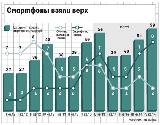 В России доля продаж смартфонов в общем объеме реализации мобильных устройств выросла осенью до 50,6-52,3%, а к концу декабря, как отметил вице-президент «Евросети» по коммерции Виктор Луканин, увеличилась до 60%. Согласно прогнозу Луканина, в этом году в России будет продано около 20 млн смартфонов, а в 2014 г. объем реализации «умных» телефонов на российском рынке составит около 25 млн штук.