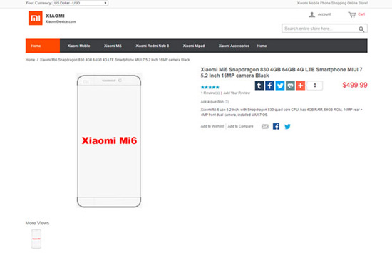 Свидетельства существования Xiaomi Mi6 уже появились в Сети. Гаджет был замечен на сайте онлайн-магазина Xiaomi Store вместе с полным перечнем технических спецификаций.