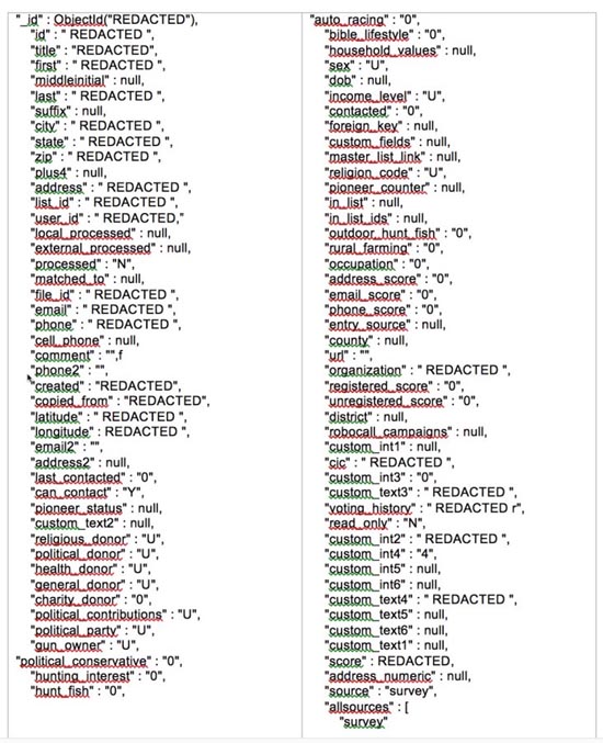 База содержала полные имена и адреса избирателей, их даты рождения, телефонные номера, информацию о политической принадлежности, уникальный ID избирателя, историю голосов, начиная с 2000 года. Также в базе присутствуют поля для предсказания голосов человека на будущих выборах. К счастью, информации о номерах социального страхования или водительских правах избирателей в базе не было. Тем не менее, Викери уверен, что данные все равно представляют интерес для многих и таят в себе большой риск. Неназванная маркетинговая фирма, в которую эксперт обратился за консультацией, полагает, что стоимость такой базы может составлять порядка $270 000.