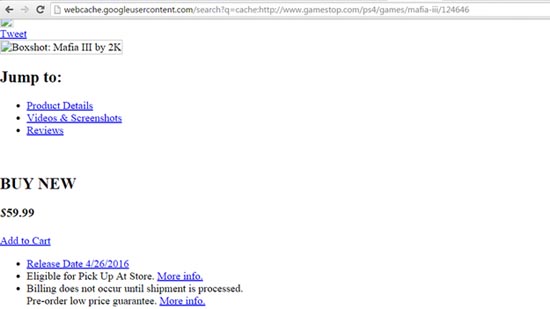 В листинге GameStop заметили, что в графе даты выхода стоит 26 апреля 2016 года. На момент написания статьи страница в магазине оказалась недоступной с пометкой «доступ запрещен». Тем не менее, в Google сохранилась грубая кэшированная версия страницы, на которой дата еще есть.