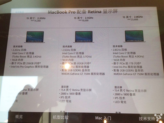 Помимо стандартных конфигураций Apple, вероятно, представит новую топовую модель Retina MacBook Pro с 15-дюймовым дисплеем. Компьютер получит процессор с частотой 2,8 ГГц (Turbo Boost до 4,0 ГГц) и накопитель на 1 ТБ. Все модели будут оснащены 16 ГБ оперативной памяти вместо 8 ГБ в нынешних конфигурациях. У младшей «прошки» будет графика Intel Iris Pro, у старших – NVIDIA Gforce GT 750M.