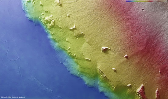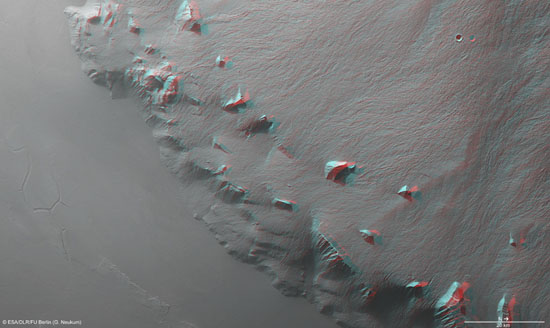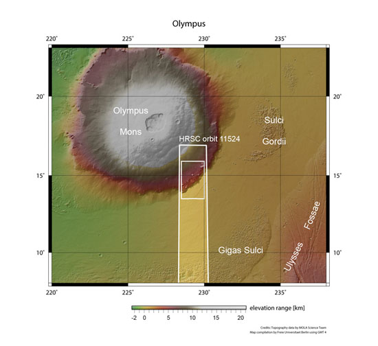 На снимках изображен пейзаж, сформированный застывшими потоками лавы на склонах марсианской горы Олимп, которая считается самым крупным вулканом Солнечной системы. Его высота — 22 км над поверхностью планеты.