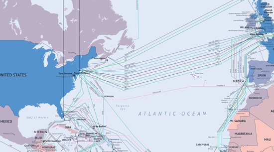 Карта демонстрирует, как на самом деле выглядит Интернет – подводные кабельные Сети опутывают планету со всех сторон. Оптоволоконные провода проложены глубоко под морями и океанами, и обеспечивают связь континентов в единое информационное поле Земли.