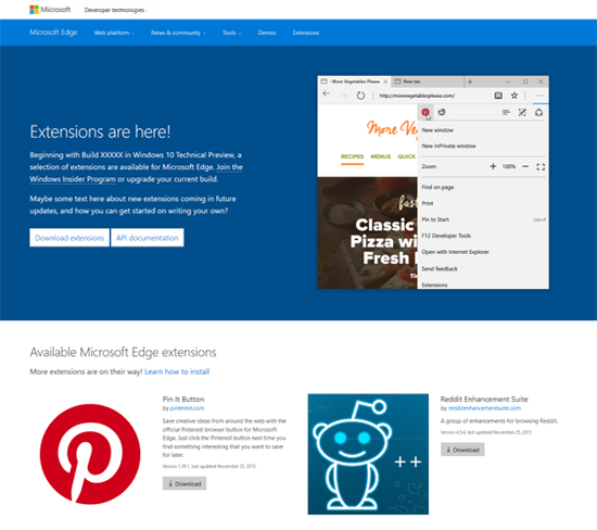 Несколько часов назад в сети была замечена официальная веб-страница – в итоге была оперативно удалена – с приглашением приступить к тестированию некоторых расширений для нового браузера от Microsoft. В частности, страница содержала расширения Pinterest и RES (Reddit Enhancement Suite). Их даже удалось скачать, но в сборке 10586.29 они не работают.